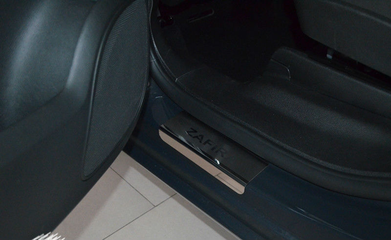 Накладки на пороги - предназначены для защиты лакокрасочного покрытия порогов Opel Zafira B 2005-2011. Накладки от компании "Nata-Niko" производятся из высокопрочной нержавеющей стали (0,5 мм) которая уменьшит воздействие на покрытие порогов или скроет уже имеющиеся дефекты. Накладки вырезаются лазером, что обеспечивает максимальное прилегание к кузову автомобиля. Установка производится на 3М-скотч (входит в комплектацию). После установки накладка надежно фиксируется на кузове автомобиля.