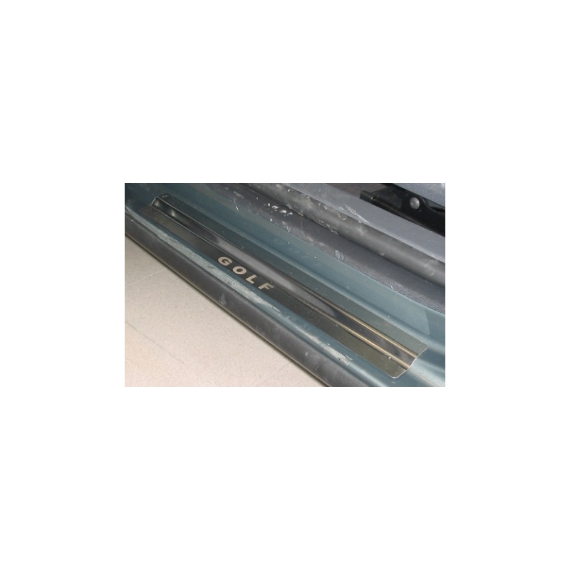 Накладки на пороги - предназначены для защиты лакокрасочного покрытия порогов Volkswagen Golf V (3D) 2004-2008. Накладки от компании "Nata-Niko" производятся из высокопрочной нержавеющей стали (0,5 мм) которая уменьшит воздействие на покрытие порогов или скроет уже имеющиеся дефекты. Накладки вырезаются лазером, что обеспечивает максимальное прилегание к кузову автомобиля. Установка производится на 3М-скотч (входит в комплектацию). После установки накладка надежно фиксируется на кузове автомобиля.